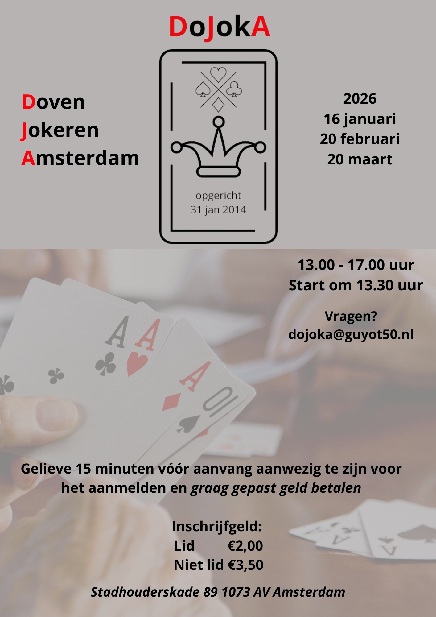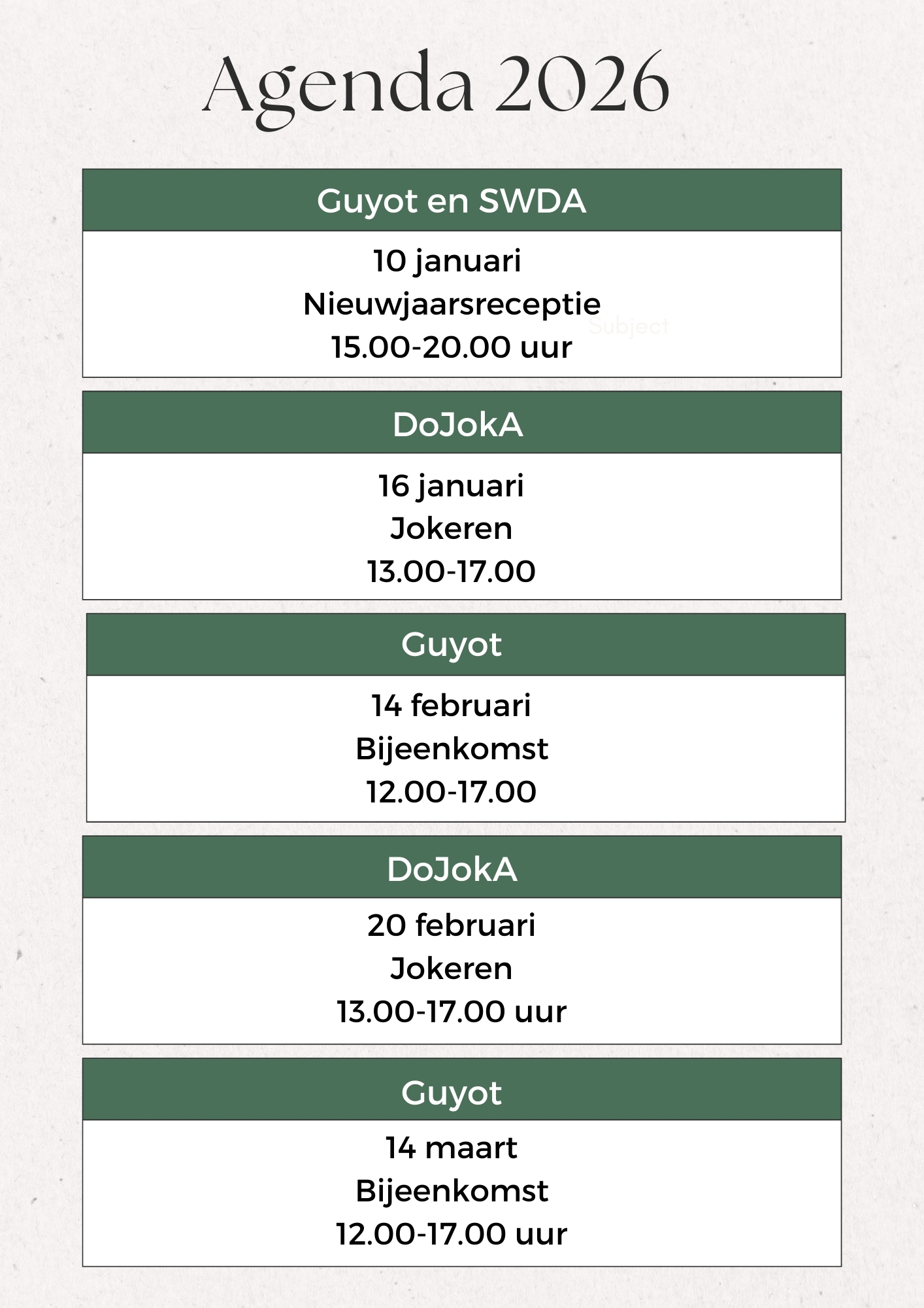 GuyotGuyot en SWDADoJokA ActiviteitenGuyot ActiviteitenLees meerDagrecreatieLees meerKJC Guyot (Klaverjassen)Lees meerDoJokA (Jokeren)Lees meerGuyot VrouwenclubLees meer Foto's / Video's Fotogalerij (Klik op foto)